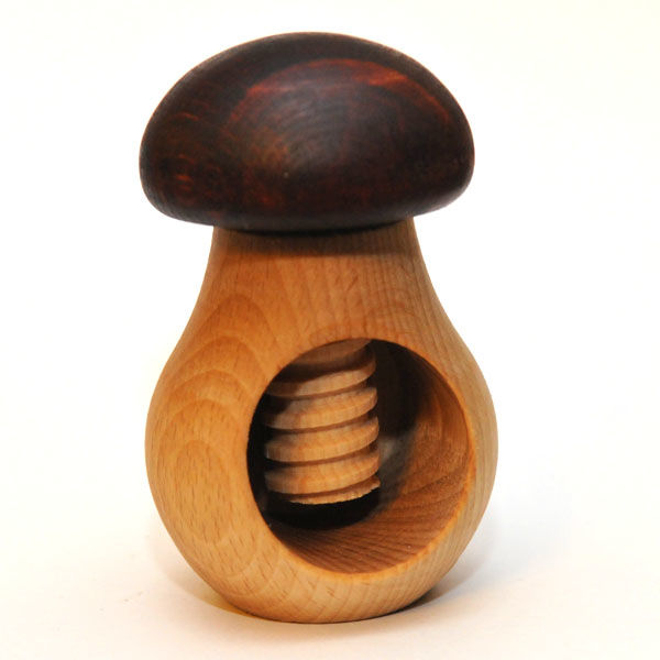 Отличный пример, когда деревянная развивающая игрушка для малыша одновременно является и хорошим маминым помощником. Все мамы по исполнению их любимым дочкам-сыночкам около полугода замечают, что тех неудержимо тянет ко всем откручивающимся-закручивающимся элементам. Необыкновенно трогательно наблюдать как еще неуклюжие детские пальчики стараются открутить крышечку у очередной добычи. Наш гриб дает богатое поле для тренировок. Чтобы его закрутить нужно работать не только пальчиками, но и всей кистью. Ну а маме и уже подросшему малышу наш гриб прослужит долго-долго в качестве орехоколки. Кладем орешек в отверстие, начинаем закручивать шляпку - и орех трескается!