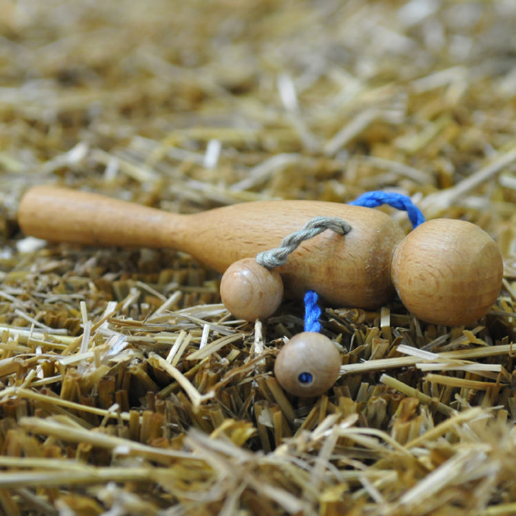 Погремушка выточена из бука. В теле куколки просверлены дырочки для шнурков, на шнурках можжевеловые шарики, за которые можно тянуть, перетягивая веревочку в разные стороны. Эти же шарики выполняют роль гремелки.